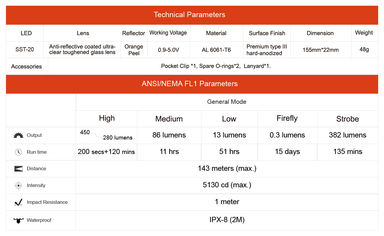 Ein Lampenkörper aus Flugzeugaluminium, welcher mit einer Typ III Oberflächenanodisierung behandelt ist, sowie eine O-Ringabdichtung für die Wasserdichtigkeit, gehören genauso zur Ausstatung, wie die CREE LED mit bis zu 20+ Jahren Lebensdauer.