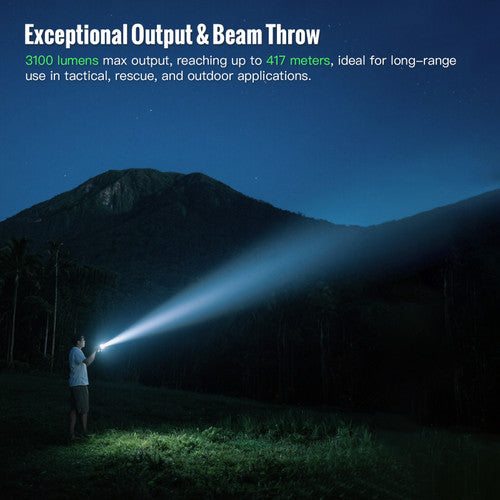 - Außergewöhnliche Lichtleistung und Leuchtweite: 3100 Lumen bei maximaler Ausgangsleistung, werden bis zu 420 Meter erreicht, ideal für den Einsatz mit benötigter großer Reichweite in taktischen, Rettungs- und Outdoor-Anwendungen